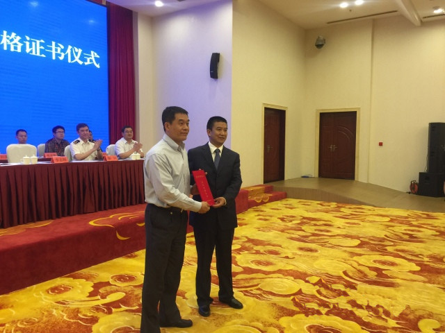聯(lián)合驗收組組長、海關總署加貿司李志輝副司長向昆明綜合保稅區(qū)管委會專職副主任張宏頒發(fā)合格證書