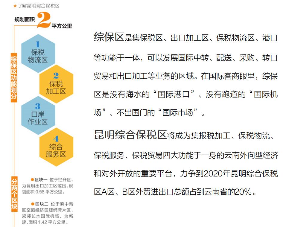 昆明將利用綜合保稅區(qū)這一特有的功能政策優(yōu)勢,積極與世界“對話”,積極聯(lián)通國內國外“兩個市場”和“兩種資源”,集聚各類高端生產要素,把昆明打造成為面向西南開放的區(qū)域性國際貿易中心、物流樞紐中心、金融中心、信息中心、總部聚集中心、旅游文化中心和開放平臺,進一步增強昆明面向南亞東南亞的影響力、輻射力、帶動力。