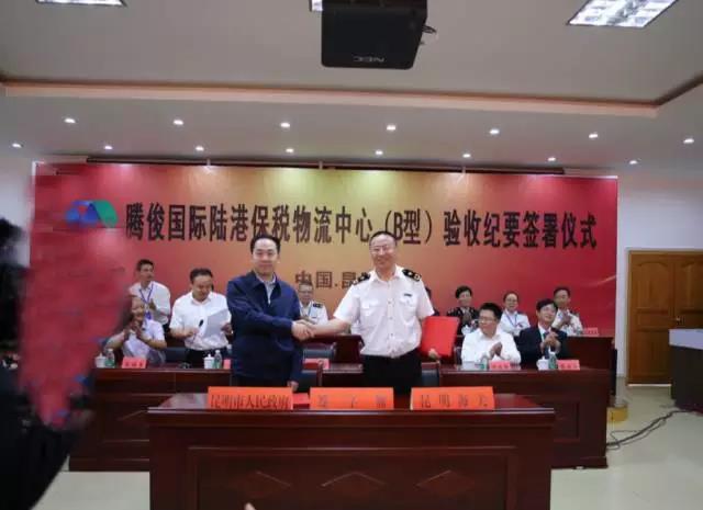 昆明海關(guān)副關(guān)長(zhǎng)馬軍與昆明市人民政府副市長(zhǎng)洪維智簽署了《騰俊國(guó)際陸港保稅物流中心基礎(chǔ)和監(jiān)管設(shè)施驗(yàn)收紀(jì)要》。昆明市人民政府高庚副秘書(shū)長(zhǎng)、晉寧區(qū)人民政府李福軍區(qū)長(zhǎng)、昆明市商務(wù)和投資促進(jìn)局徐增雄局長(zhǎng)、及省、市、區(qū)各級(jí)有關(guān)部門(mén)負(fù)責(zé)人參加了驗(yàn)收工作。
